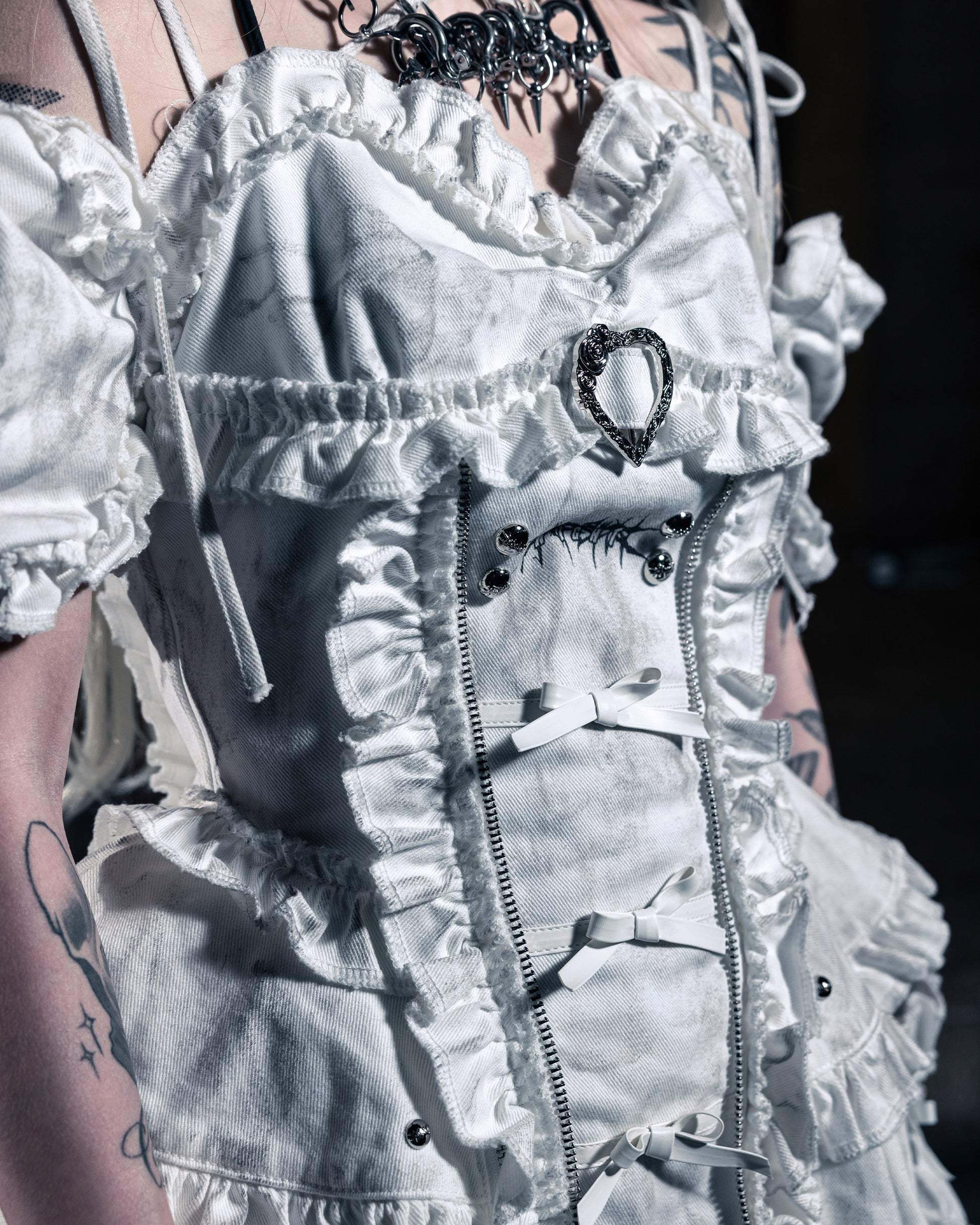 This piece infuses punk elements and aesthetics with pollution white denim materials that undergo heavy wash processes, exuding elegance and individuality.